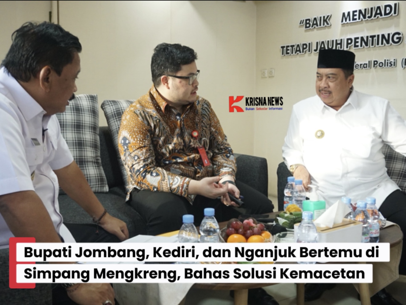 Krisnanews.id – Jombang – Bupati Jombang Warsubi, Bupati Kediri Hanindhito Himawan Pramana, dan Bupati Nganjuk Marhaen Djumadi melakukan pertemuan segitiga di Pos Polisi Mengkreng, Kediri, pada Rabu sore (08/04/2026). Ketiganya membahas rencana pembangunan jembatan layang (flyover) di simpang Mengkreng agar lalu-lintas lancar yang menghubungkan tiga kabupaten tersebut.