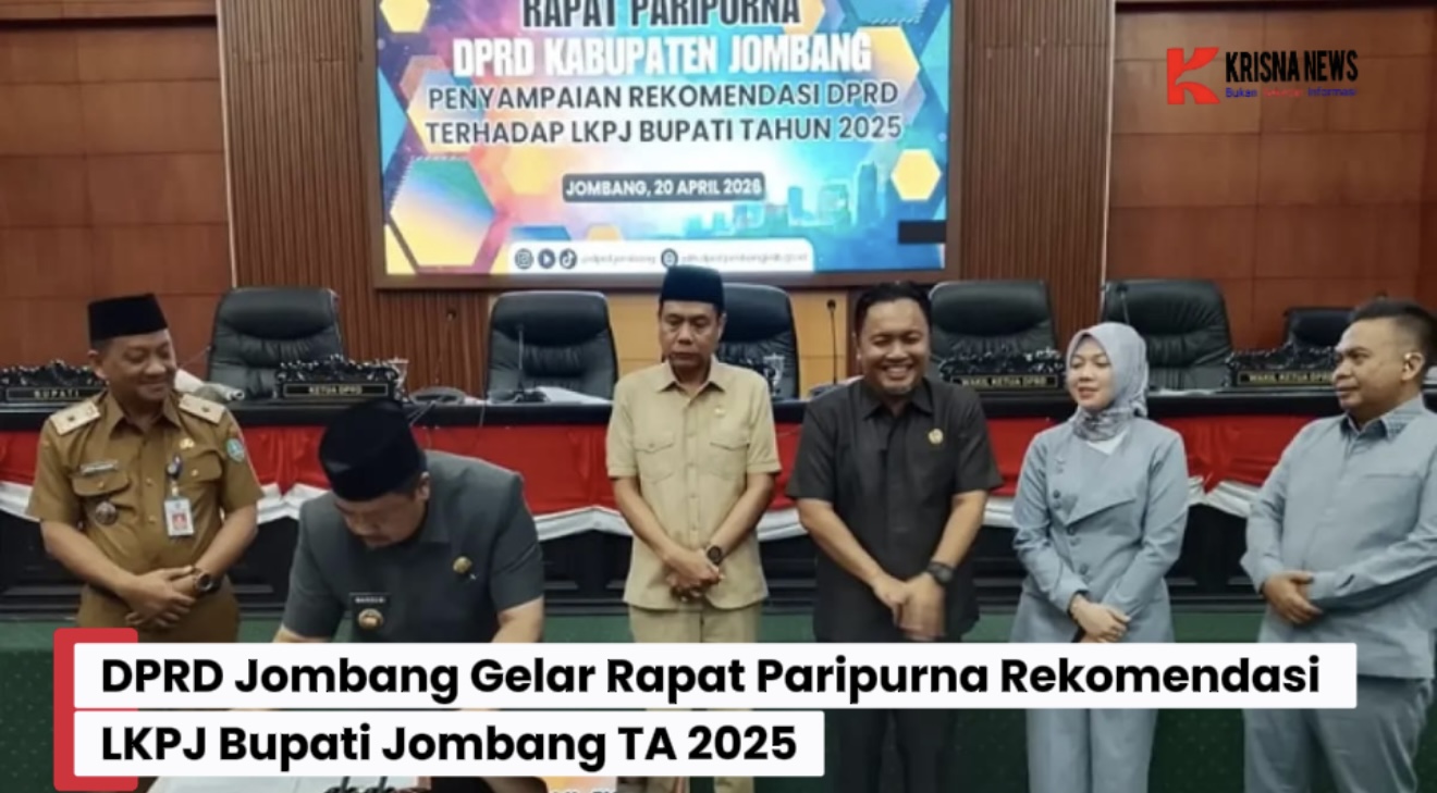 Krisnanews.id – Jombang – DPRD kabupaten Jombang menggelar rapat paripurna dengan agenda penetapan keputusan DPRD Nomor 100.3.3/4/DPRD/415.14/2026 tentang rekomendasi atas Laporan Keterangan Pertanggungjawaban (LKPJ) Bupati Jombang Tahun Anggaran 2025, Senin (20/4/2026).