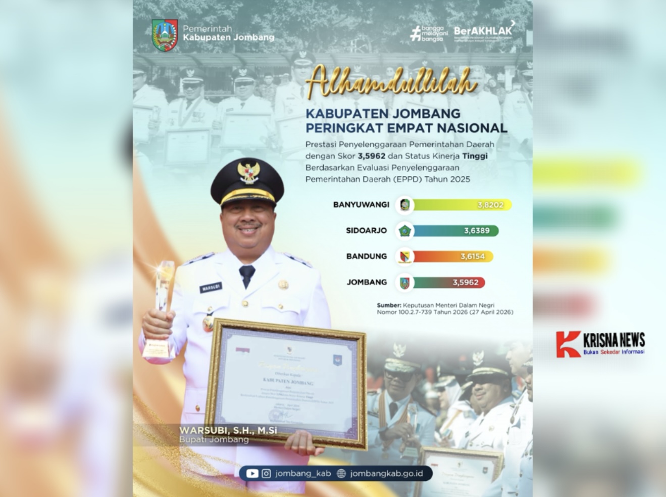 Di sisi lain, penghargaan yang diterima oleh Bupati Warsubi tersebut merupakan bentuk pengakuan resmi dari Pemerintah Pusat melalui Kementerian Dalam Negeri RI (Kemendagri) atas keberhasilan Kabupaten Jombang dalam menyelenggarakan pemerintahan daerah yang efektif, transparan, dan akuntabel sepanjang tahun 2025.